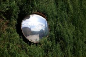 Verkehrsspiegel, zugewachsen von Zypressen